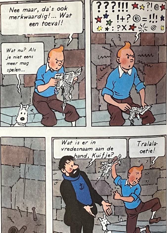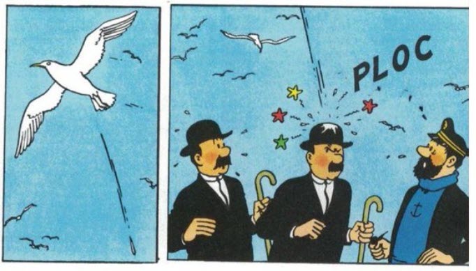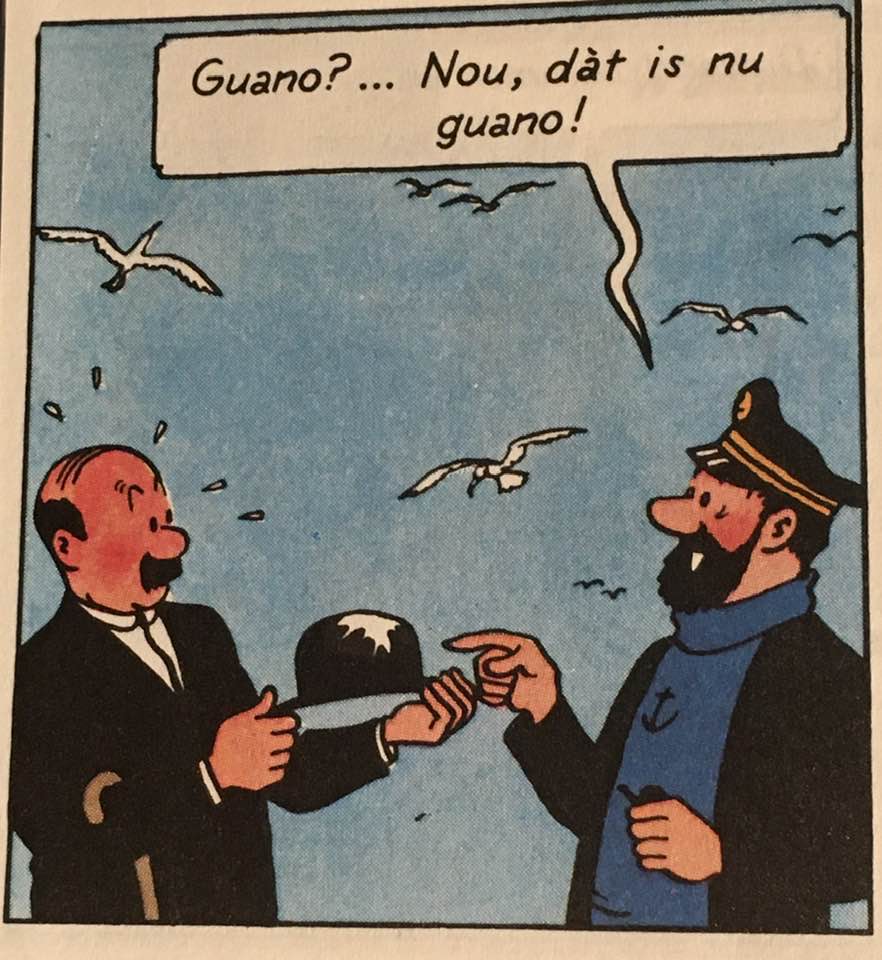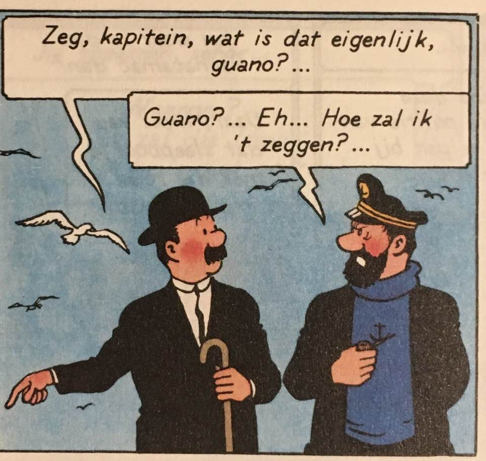 Tijdens het wachten merkt één van de detectives een zak op met het opschrift “guano”. Hij vraagt aan kapitein Haddock wat guano is en terwijl die naar een passend antwoord zoekt, zorgt een meeuw ervoor dat het antwoord heel duidelijk is : vogelstront.