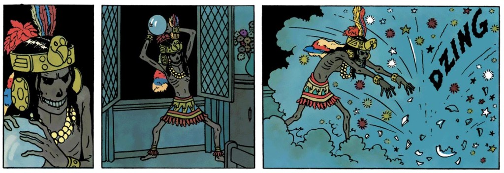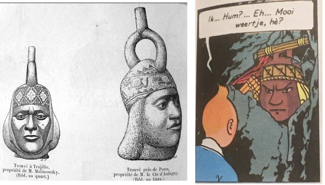Links zie je een vaas met de vorm van een mensenhoofd. Rechts zie je Kuifje die net zo’n vaas ziet, al denkt hij eerst dat hij oog in oog met een Peruaan staat.