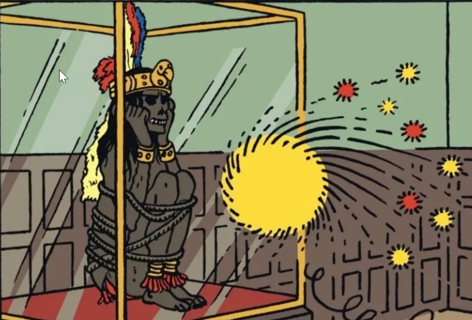 Maar het verdict is ongenadig en de brandstapel wacht op onze helden alvorens er een laatste onverwachte gebeurtenis ingrijpt. En daar speelt de zon een hoofdrol in. Maar niet zoals de Quichua het hadden verwacht. Kuifje neemt van hen de regie over…