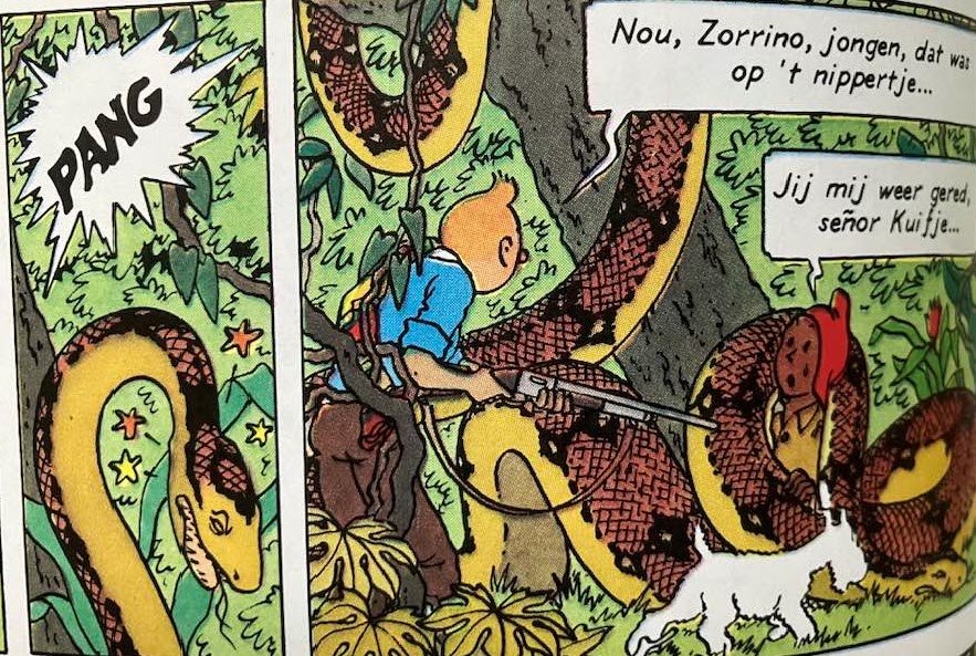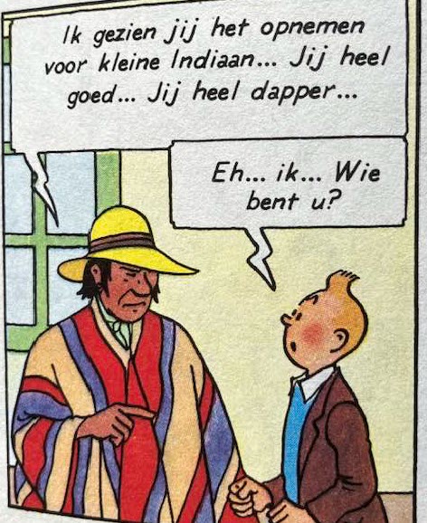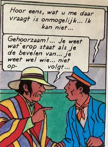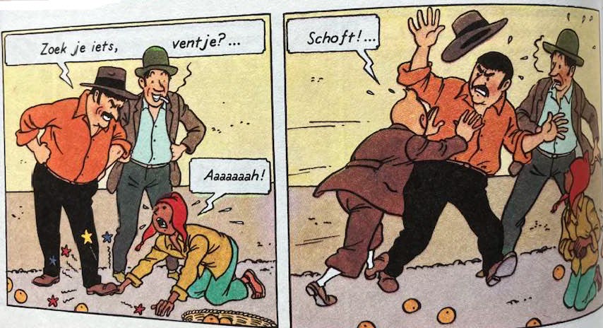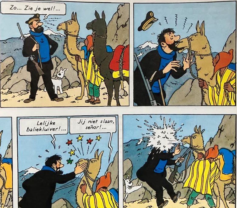 En Haddock blijft pech hebben met de lama’s. Als hij tot zijn vreugde ziet dat Kuifje zijn belager net op tijd kan afslaan, is Haddock wat te enthousiast en te dicht bij de lama. En natuurlijk volgt alweer de afstraffing.