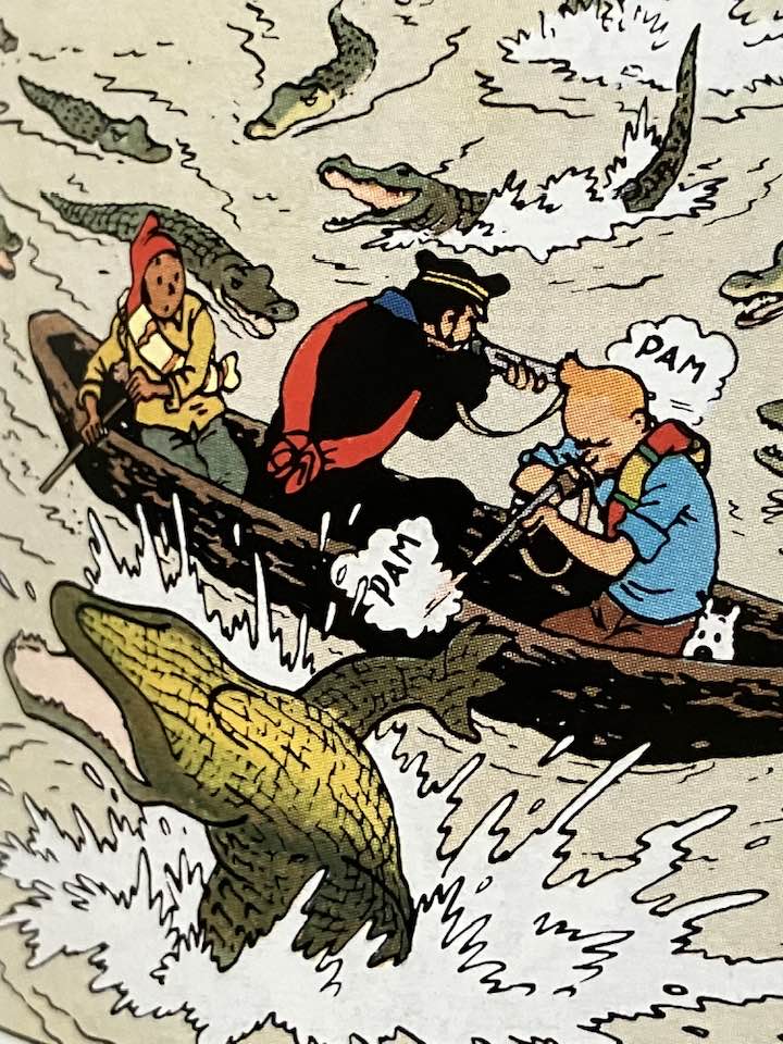 In ”de zonnetempel” is het dus de lama die centraal staat in de running gag. En het begint al vroeg in het verhaal, als Kuifje en Haddock in de havenstad Callao wachten op het schip waarvan ze vermoeden dat Zonnebloem aan boord is. Haddock voelt zich optimistisch en geniet volop van de “couleur locale”. Tot hij de lama ontmoet. En dan loopt het mis.