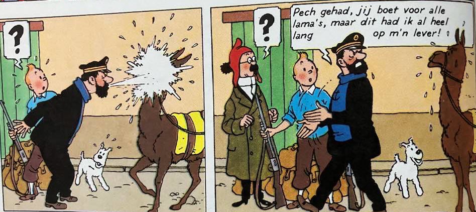 Hergé is echter niet zo wreed om Haddock geen wraak te gunnen. En die krijgt hij ook op het einde van het album. Dan volgt de afrekening met de lama’s.