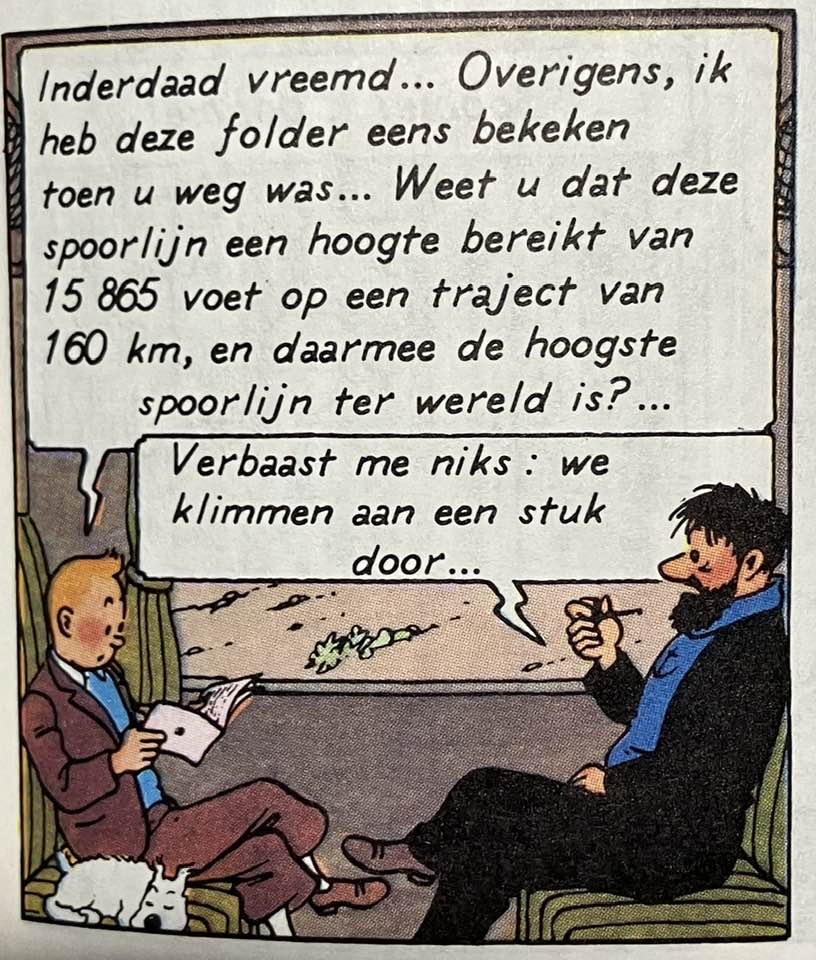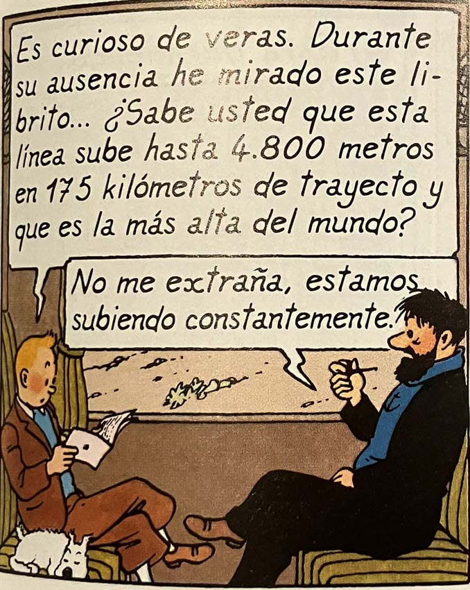 In het album “de zonnetempel” rijden kapitein Haddock en Kuifje in de hoogste trein ter wereld. Hergé is goed gedocumenteerd met de tweedelige “Encyclopédie des Chemins de fer illustrée” en kan dus perfect de Peruaanse locomotief tekenen. Meer zelfs, hij zorgt er ook voor dat ook de lezer weet hoe bijzonder de trein is die Kuifje en de kapitein vervoeren. Daarvoor past hij een truukje toe dat hij ook al gebruikte in “de scepter van Ottokar” : Kuifje is in het bezit van een brochure en leest de kapitein voor. Het vervelende is dat de Nederlandse versie het heeft over voet. Gelukkig is er nog de Spaanse versie die vermeldt dat het over 4800 meter gaat.