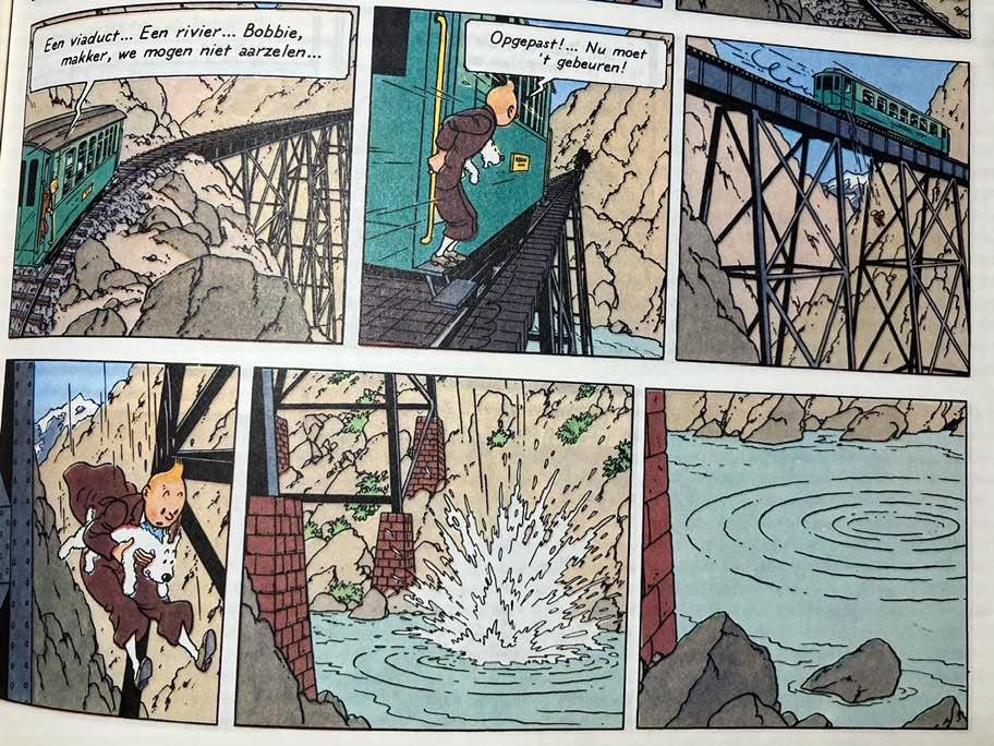 Hieronder zie je twee maal een spoorbrug. Maar naast mekaar gezet, lijkt het net of de treinwagon met Kuifje over een en dezelfde brug rijdt.