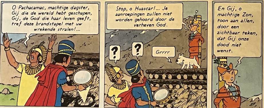 Maar Columbus had wel meer truukjes in zijn mouw. Zo heeft hij een maaneclips gebruikt om de indianen onder druk te zetten. En Hergé heeft eenzelfde truuk gebruikt om Kuifje te redden van de brandstapel. Kuifje vindt de datum en tijd niet in een almanak maar in een stuk krant dat om de doos geweerpatronen was gewikkeld. Daarna vraagt hij als gunst om op die datum en tijd te mogen sterven.