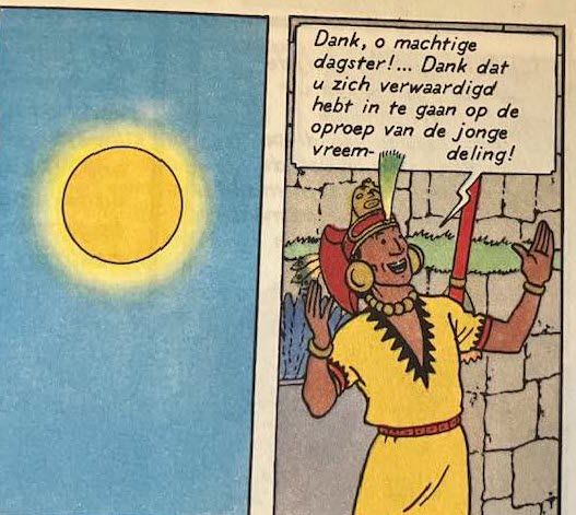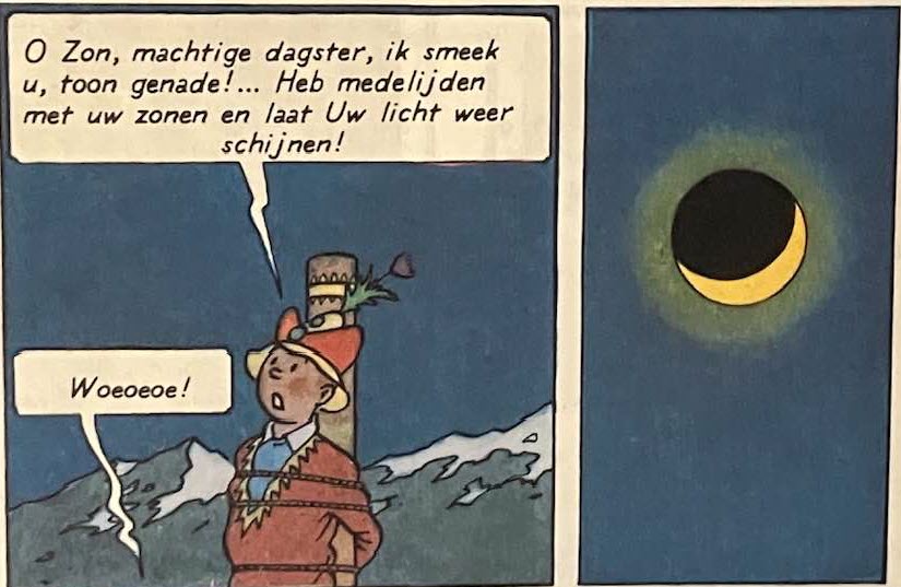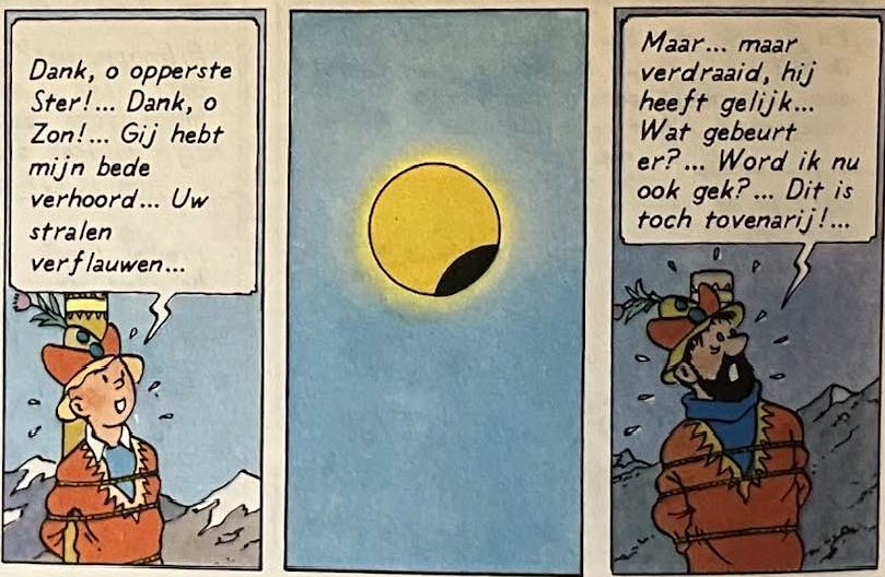 Voor de zonnetempel en de zoon van de zonnegod maakt Hergé natuurlijk gebruik van een zonsverduistering. Maar het principe blijft hetzelfde.