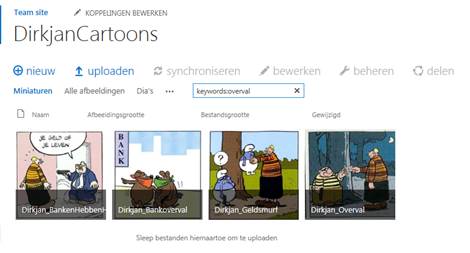 Stel dat je een afbeeldingenbibliotheek hebt met een hele reeks cartoons (bijvoorbeeld van Dirkjan). Nu zou het handig zijn als ik via een trefwoord snel cartoons kan zoeken die geschikt zijn in een bepaalde context.